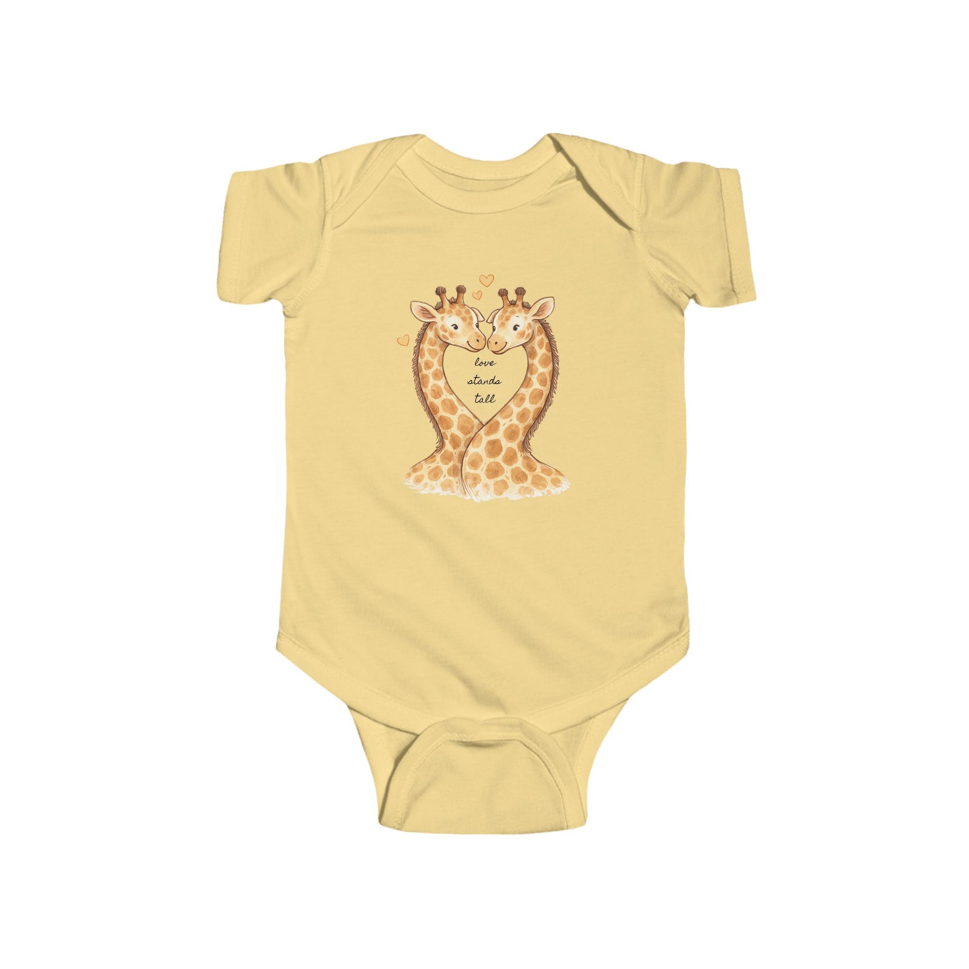 Soft, sweet, and quietly joyful — this infant bodysuit brings a little story to everyday wear. Two gentle giraffes form a heart above tiny shoulders, as if sharing a secret just between them. Side seams and ribbed binding hold the shape through washes while the snap closure makes dressing and diaper changes quick and calm. Wear it at home, tuck it under a cardigan for a neighborhood stroll, or layer it for a family photo — the print adds a soft, loving note to first smiles and quiet moments.