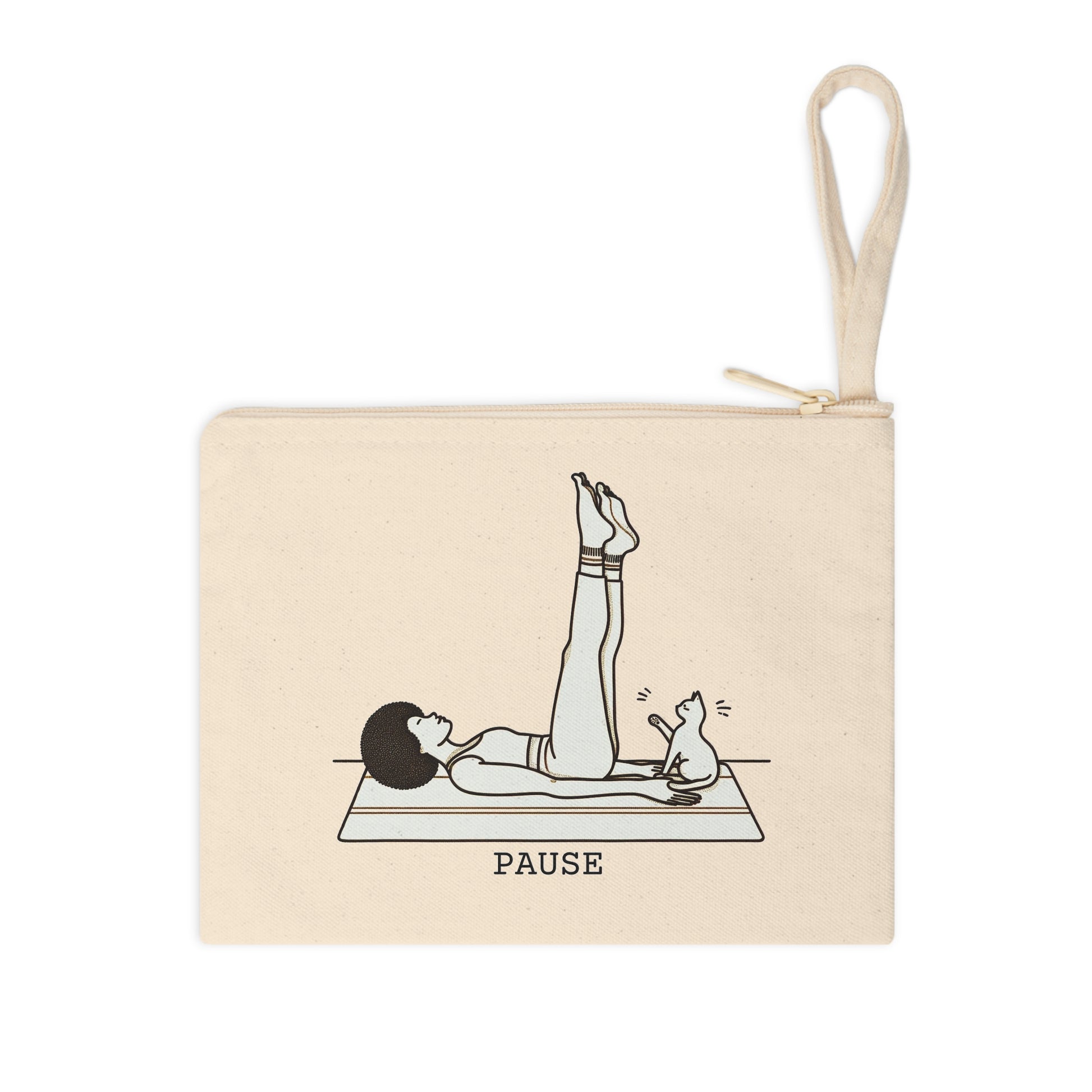 Embrace the zen with our "Pause" Accessory Zipper Pouch, a must-have for any millennial balancing the hustle with moments of peace. Made from cotton, it showcases a lady in yoga bliss with her cat cheekily interrupting—because what's a stretch session without a little paws? It's the perfect blend of function and pun, ideal for storing your essentials while reminding you to hit pause and enjoy the now, cat interruptions and all.